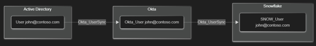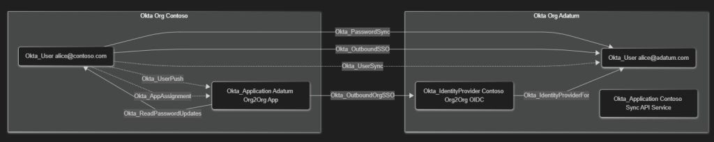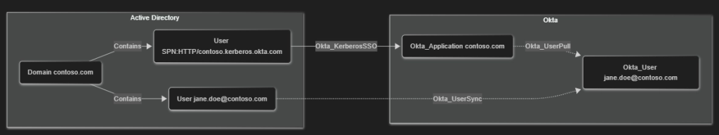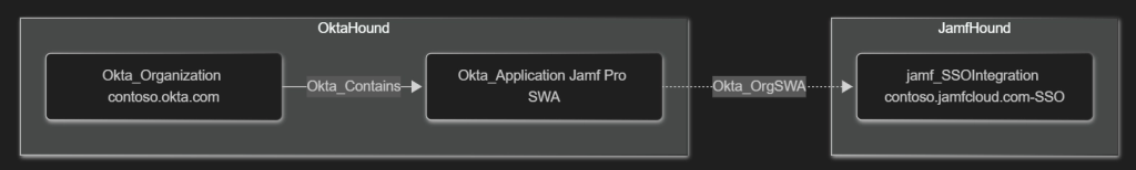 On the other hand, real-world Okta deployments are seldom isolated and often contain inbound and outbound trust relationship in the form of SAML/OIDC SSO, password replication, or group membership synchronization. These hybrid or cross-technology relationships are part of OktaHound’s data model.