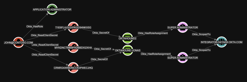 Malicious actors could easily abuse this behavior to first read the client secret of a highly-privileged application and then authenticate with it against Okta, impersonating the application identity. This could lead to unexpected privilege elevation, which we model using the Okta_ReadClientSecret edge.