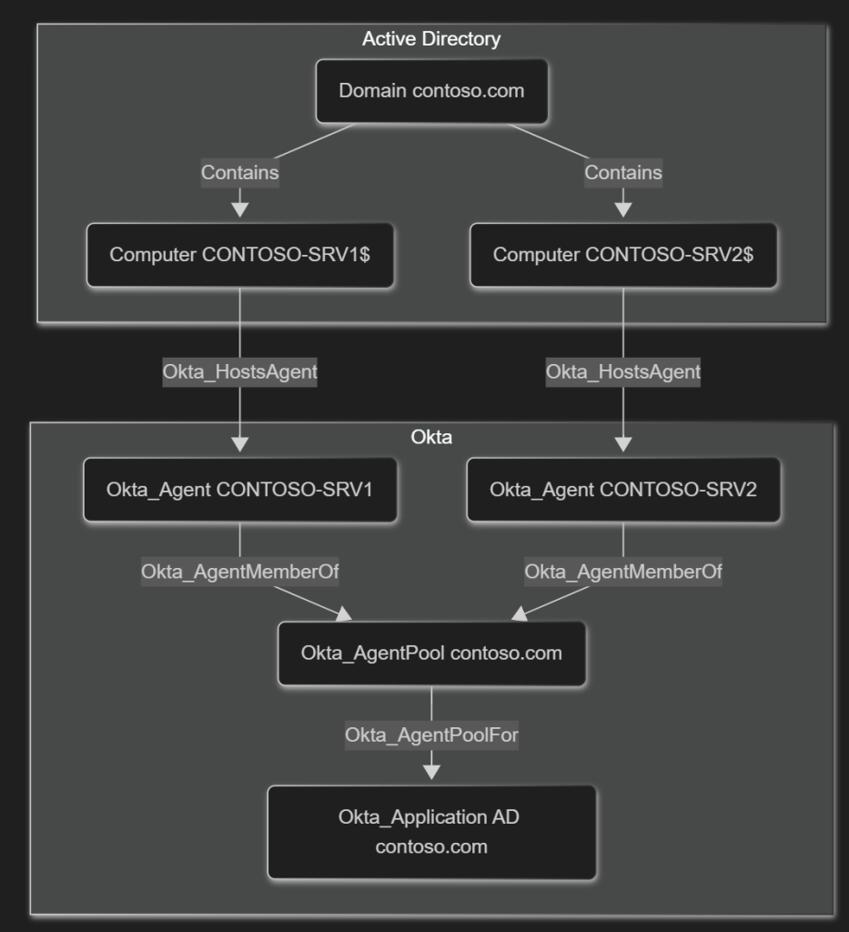 The relationships between servers and agents they are hosting are represented using the Okta_HostsAgent, Okta_AgentMemberOf, and Okta_AgentPoolFor edges.