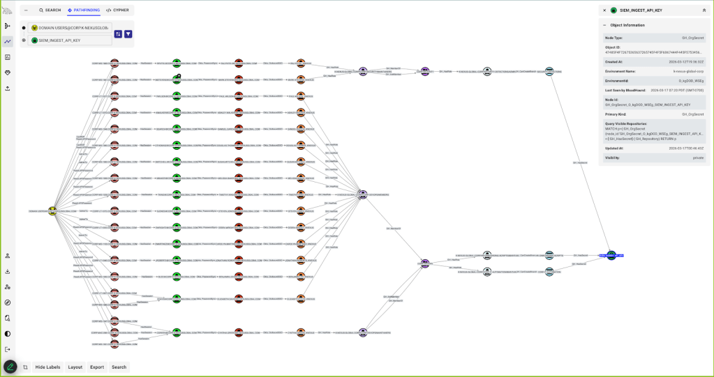 Nothing in this chain is inherently misconfigured: a DevOps engineer has broad repository access, GitHub integrates with Okta, and Okta integrates with Active Directory. Each decision makes sense in isolation, but identity risk doesn’t come from individual decisions—it comes from how those decisions compose. A path now exists from any compromised Active Directory user to sensitive GitHub infrastructure.