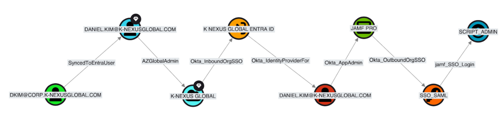 Perhaps the most important aspect of modeling Jamf is what happens when these capabilities intersect with other platforms. In real environments, attackers rarely operate within a single system. They move between identity providers, device management platforms, and other services as they progress toward their objective. This creates hybrid attack paths spanning multiple systems.