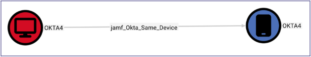 This is one of the newest exciting edges introduced for JamfHound to visualize the impacts of compromise between JAMF Pro and Okta organizations using a hybrid edge. Okta as an IDP typically requires devices to be registered for MFA prompting or platform security checks resulting in the population of known device attributes. By matching on the globally unique UDID attribute Apple assigns to each of their macOS laptops in both environments, a traversable edge is created between jamf_Computer nodes and the recently released OktaHound Okta_Device node to signify the same device is registered in both platforms creating a hybrid edge between the two collections.
