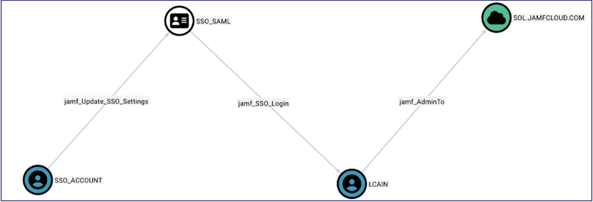 This new edge represents the relationship between a configured JAMF SSO integration and JAMF Pro accounts and groups. When SSO is configured in JAMF Pro, an identity provider can provide attributes, such as username or email, that match to local accounts to authenticate to JAMF Pro. This allows inheriting the permissions and group assignments of local accounts. Additionally, if SSO is configured to replicate group attributes, IDP-authenticated principals can inherit the permissions of any matching groups sent via SAML attributes. This is a critical traversable edge for rendering the attack paths discussed below and simplifies hybrid path creation with other open graph collectors.