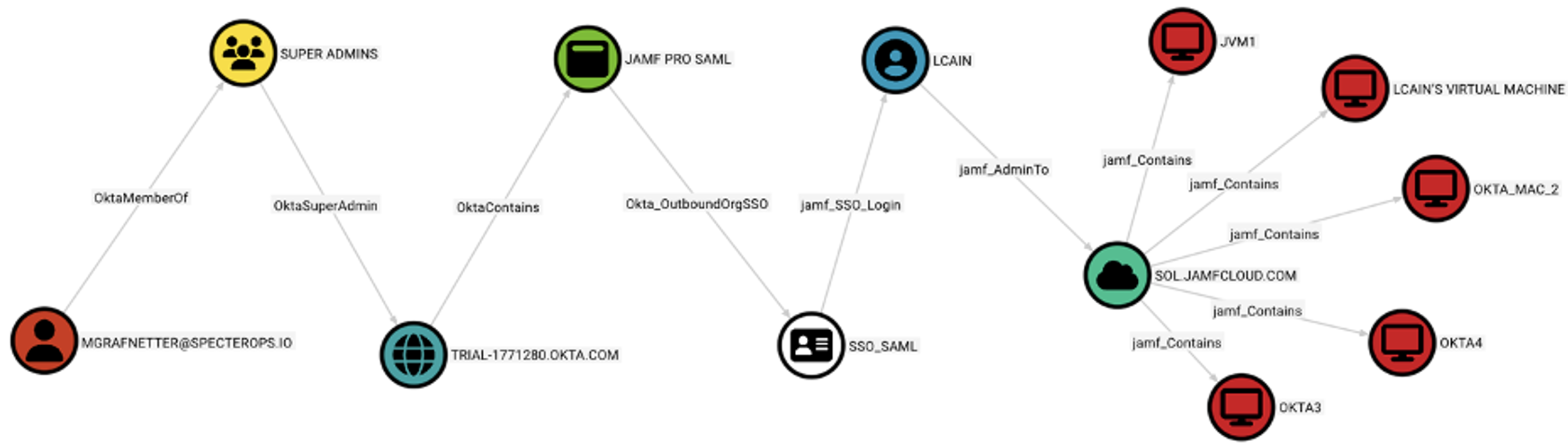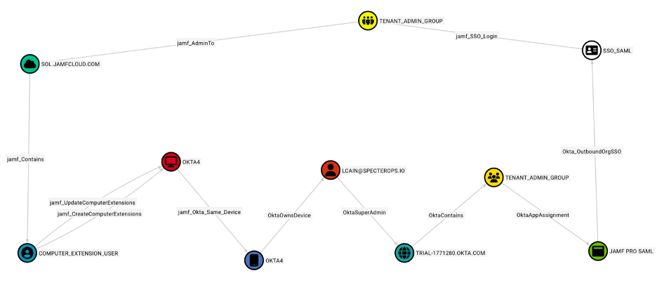 The addition of the latest node and edges also allows use of BloodHound to visualize what we have found to be complex and common attack paths in modern enterprises which we refer to as hybrid attack paths or attack paths with hybrid edges. Rarely, during an offensive security assessment do we find ourselves compromising a single technology platform such as JAMF or Okta and accomplishing all our adversarial objectives. Instead, we more commonly pivot through different technologies during an assessment. One example shown below demonstrates compromising a JAMF Pro account that can execute code as a computer extension on a macOS device belonging to an Okta administrator. The Okta organization also has an admin group that is assigned to the JAMF Pro application with SAML SSO which matches one of the JAMF Pro admin groups. Since group attributes are configured to replicate between JAMF Pro and Okta, any user assigned to the matching group in Okta that authenticates to JAMF will have group assignment carried over into JAMF Pro granting full access administrator privileges.