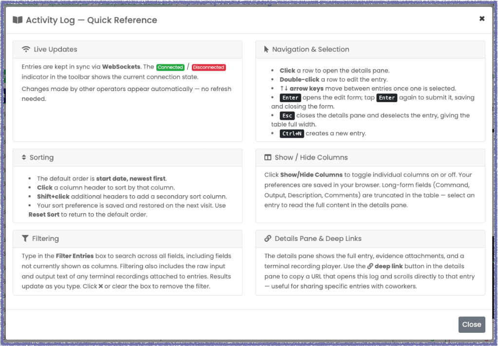 We’ve also added a new “Help” button with a quick reference card that explains how to use the features of the operation log. The card includes information on keyboard navigation, shortcuts, filtering, sorting, and general usage.