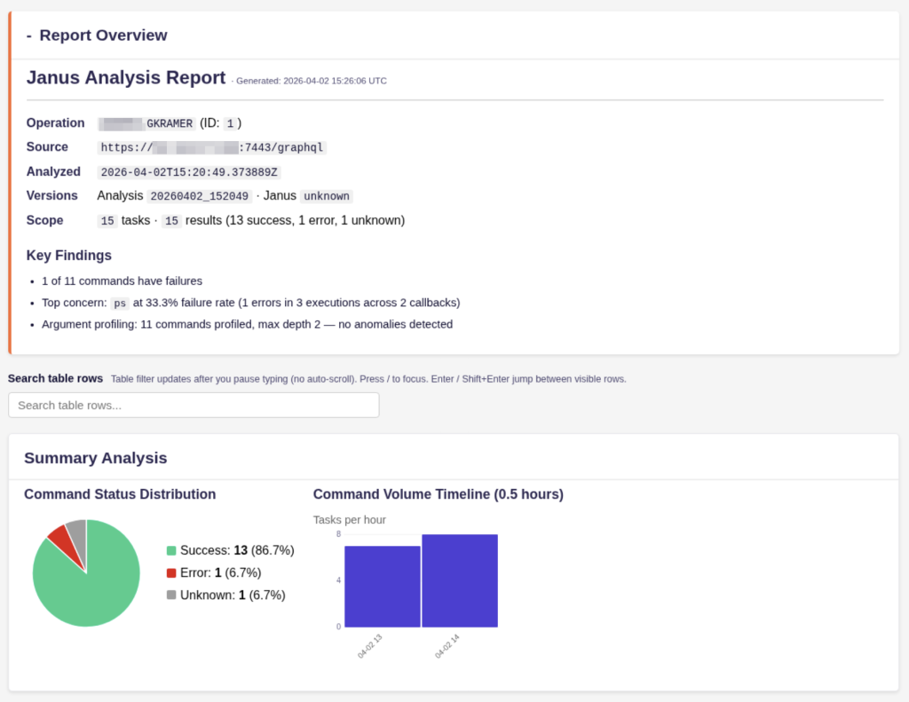 Janus exists to capture and surface that friction, turning errors into something useful. It does this by parsing logs from command and control (C2) servers, showing how tools actually behave during operations and not how we think they behave. Janus performs its entire analysis without the use of LLMs, ensuring engagement data remains fully controlled. LLMs are an optional layer for querying and interaction, where you can filter or redact any shared data in accordance with organizational policies. From this analysis, teams can direct resources to fix those issues, inform operators, or build new tools to reduce the friction. In turn, this provides benefits for every layer of operations.