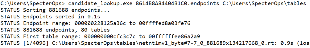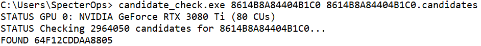 A common concern with public NTLMv1 recovery services is that a client name could be exposed from a cracked NT hash. If a service reconstructs the NT hash from the recovered DES keys and cracks it offline, the recovered plaintext password may include a client name, thereby revealing the target’s identity. With the decoupled approach, we present a potential solution: only the precompute and check phases require knowledge of the ciphertext. During the precompute phase, each candidate represents a potential match, but the vast majority are false positives. So while one of the candidate chains may contain your CT, it’s one of millions.