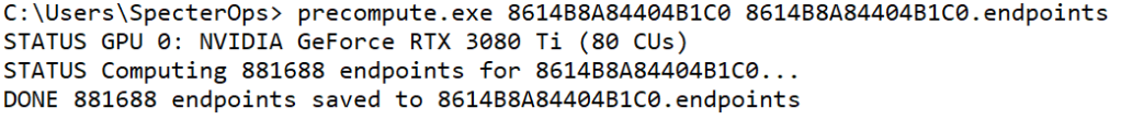 We can then perform our recovery process, starting with precompute. The precompute application takes a CT followed by an output filename for the computed endpoints.
