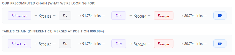 After applying the reduction function, R709139, we get completely separate keys Ka and Kb. But after 91,754 links, two different ciphertexts, 29ACCD0DFEA880EF (CT1) and 29ACCD0DFEA8804A (CT2), produce the same key 80A8FE0DD9E4A6 (Kmerge). From that point forward, the chains are identical and result in the same endpoint, 00AAF6AB1219EF (EP). So while CTactual ended with one of our target endpoints, it did not contain our CT, an unfortunate false positive.