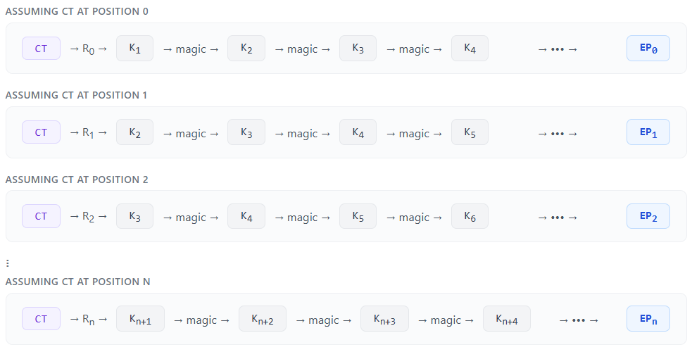 Lastly, we have our candidate check. With our candidates identified, we’ll need to recompute all chains to the stored candidate positions and verify whether our CT actually exists at those positions. If so, we can step back and identify our DES key.