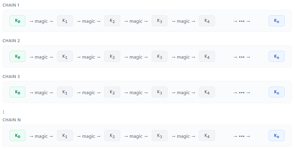 The “magic” is two operations. First, DES encryption using our key and a static challenge to produce a CT, followed by a reduction function. One link of a chain is shown below.